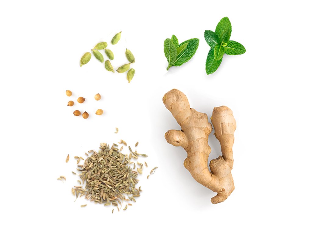 - Gyömbér, Borsmenta, Kömény, Ánizs, Koriandermag és Édeskömény sajátos kombinációját tartalmazza.