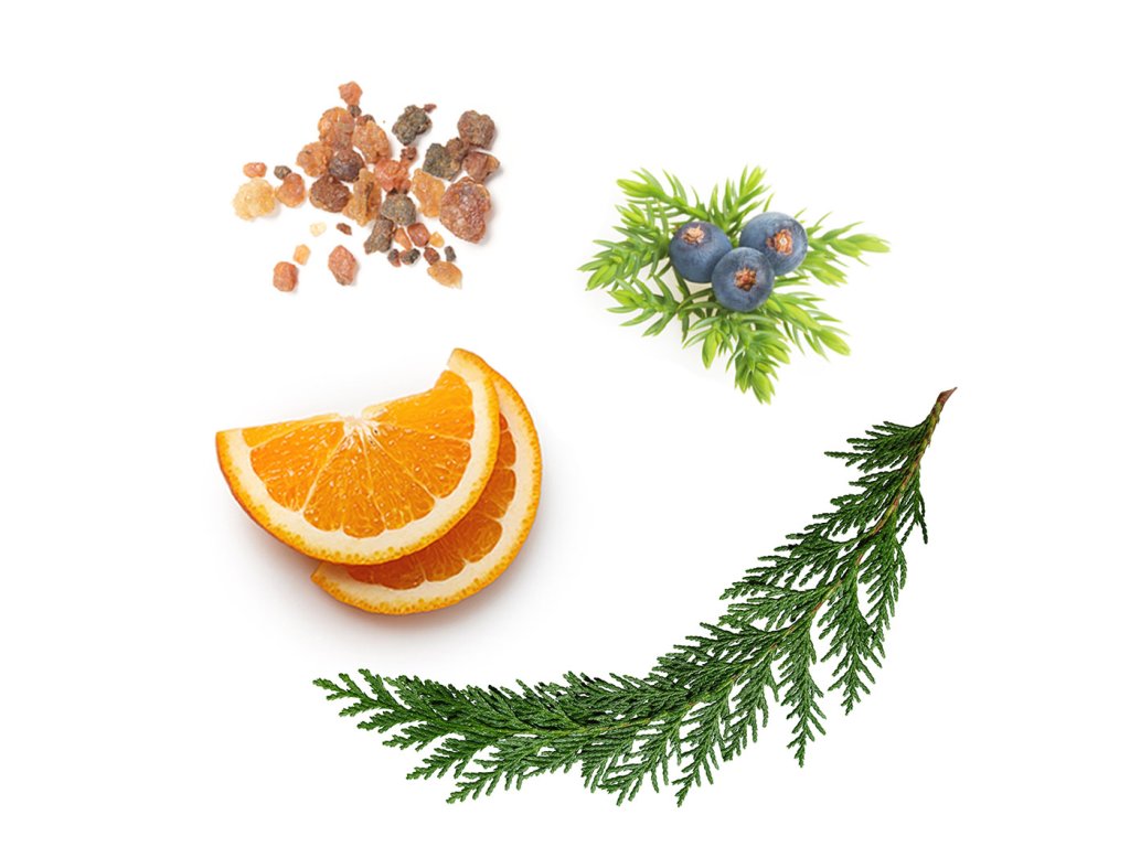 Abies sibirica olaj, Cupressus sempervirens ágából/leveléből kivont olaj, Juniperus communis terméséből kivont olaj, Picea mariana ágából/leveléből kivont olaj, Citrus aurantium dulcis (narancs) héjából kivont olaj, Boswellia serrata olaj, Pimenta ocinalis (szegfűbors) leveléből kivont olaj, Pimenta ocinalis (szegfűbors) terméséből kivont olaj, Cistus ladaniferus olaj, Carum carvi (kömény) magjából kivont olaj, Cistus ladaniferus levelének/szárának kivonata, limonene*, eugenol*, linalool*