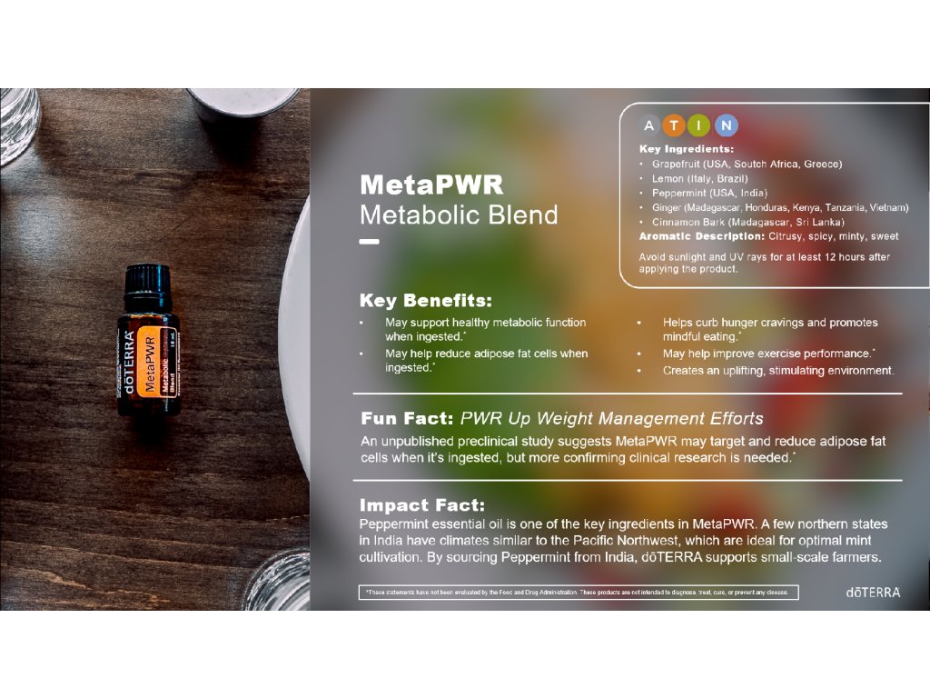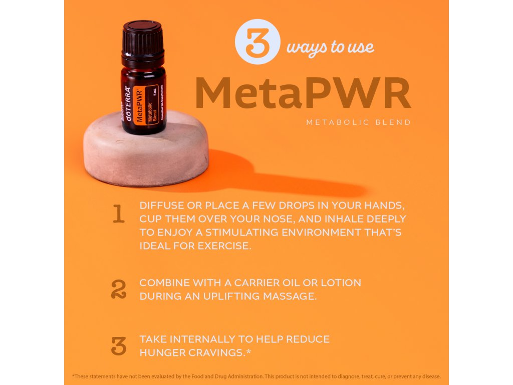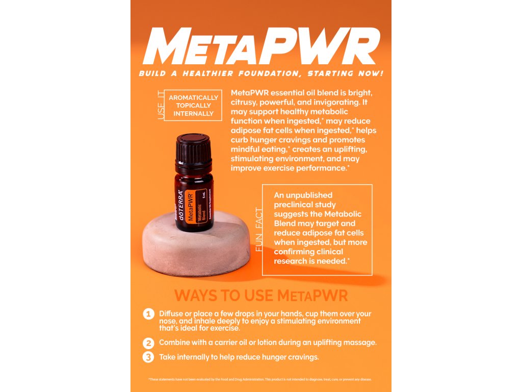 A MetaPWR esszenciálisolaj-keveréket úgy állítottuk össze, hogy támogassa a fokozott vitalitásra, a jobb táplálkozási döntésekre és a jóllét fenntartására összpontosító életstílust. A doTERRA klinikai és orvosi kutatói által kidolgozott Meta PWR keverék a különleges és kiegyensúlyozott arányban adagolt CPTG™ minősítésű grépfrút, citrom, borsmenta, gyömbér és fahéj esszenciális olajokból áll össze. A citrusos, mentás és fűszeres olajok elegyítése teszi a Meta PWR-t hatásos ételízesítővé, amely segít kielégíteni az édesség utáni sóvárgást.