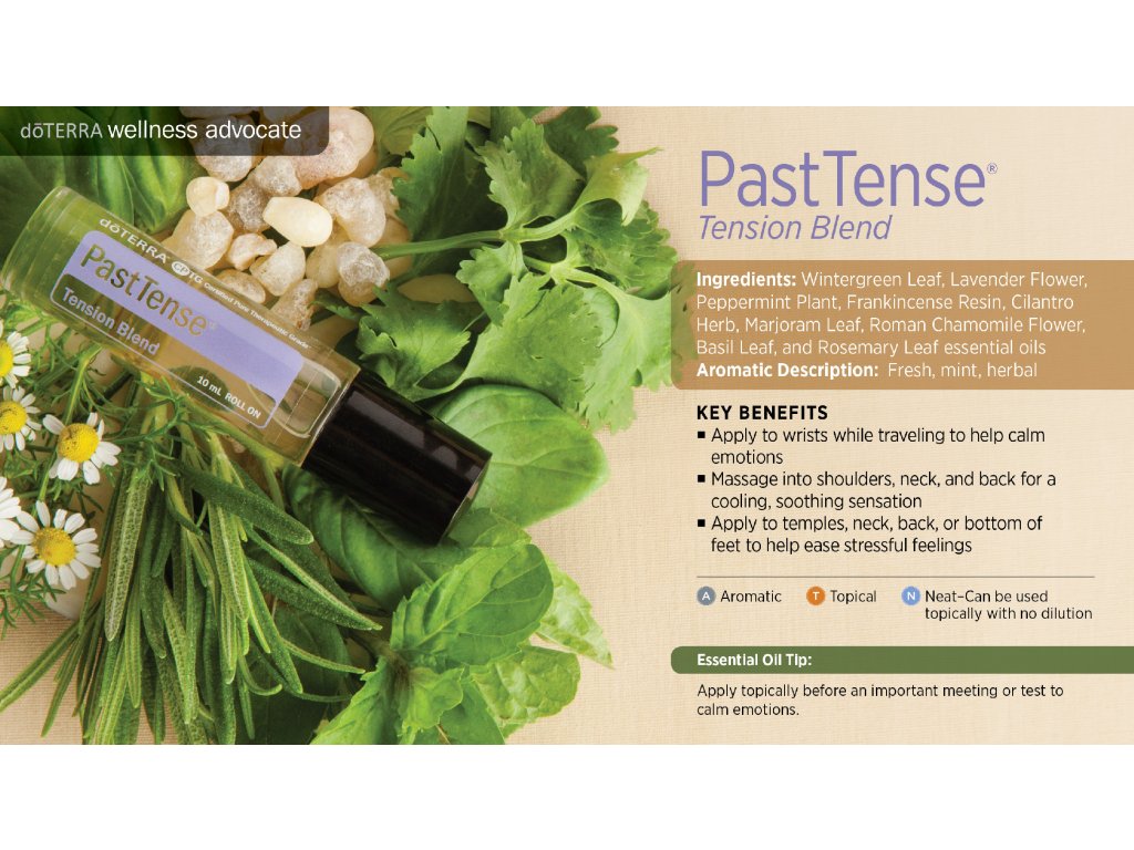 - A CPTG (Tanúsított, Tiszta, Letesztelt Minőségű) esszenciális olajokból megalkotott PastTense Ellazító keverék a kiegyensúlyozott, harmonikus közérzet megteremtésének kényelmes és egyszerű módját kínálja.