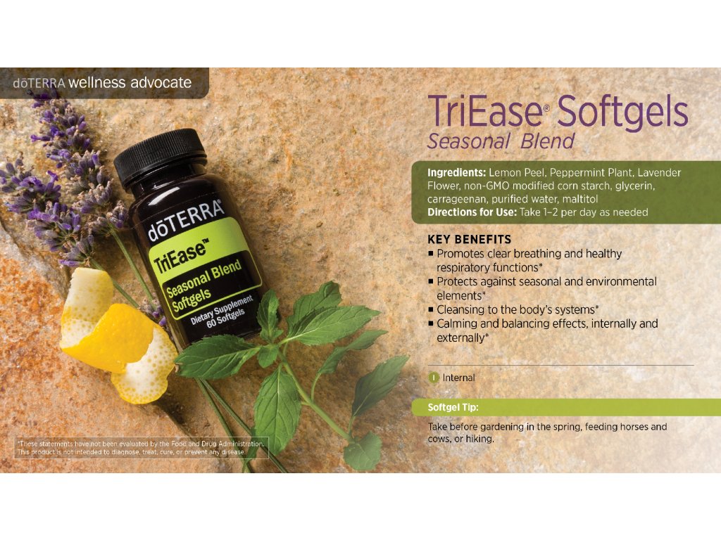 A TriEase lágyzselatin kapszula megalkotásakor a változó évszakokat tartottuk szem előtt. Minden lágyzselatin kapszula egyenlő részben tartalmaz citrom, levendula és borsmenta esszenciális olajat, amely a tapasztalt és a kezdő esszenciálisolaj-használók által egyaránt gyakran alkalmazott kombináció. Mostantól a TriEase lágyzselatin kapszulának köszönhetően gyorsan és egyszerűen beveheti ezt a kombinációt utazás és szabadtéri programok közben, vagy amikor a legnagyobb szüksége van rá.