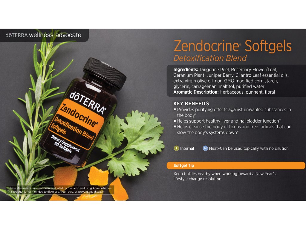 A Zendocrine lágyzselatin kapszula a Zendocrine újraindító keverék tangerin, rozmaring, muskátli, borókabogyó és korianderzöld esszenciális olajokból álló szabadalmazott keverékét tartalmazza. A Zendocrine lágyzselatin kapszula gyors és egyszerű módot kínál a dōTERRA Zendocrine újraindító keverék bevitelére, akár éppen úton van, ha siet, vagy egyszerűen csak kedveli a lágyzselatin kapszulák praktikusságát!